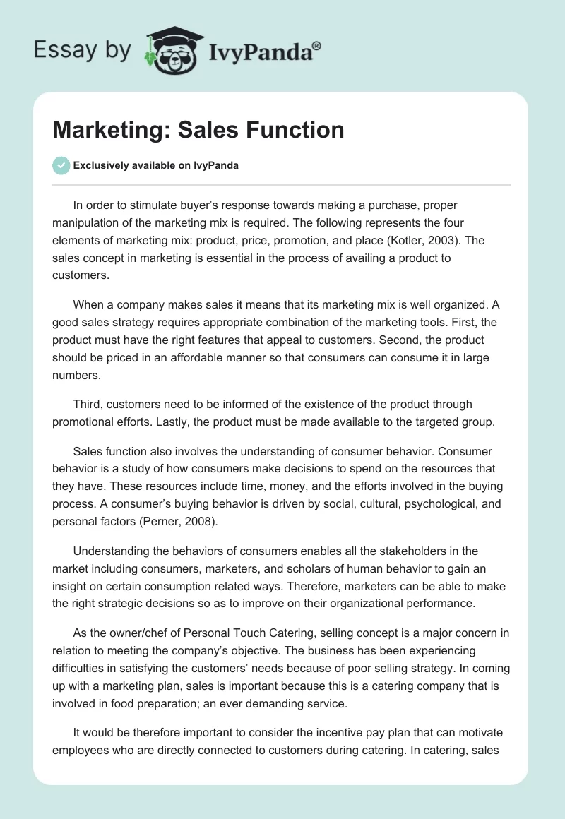 As the owner/chef of Personal Touch Catering, selling concept is a major concern in relation to meeting the company’s objective. The business has been experiencing difficulties in satisfying the customers’ needs because of poor selling strategy. In coming up with a marketing plan, sales is important because this is a catering company that is involved in food preparation; an ever demanding service.
