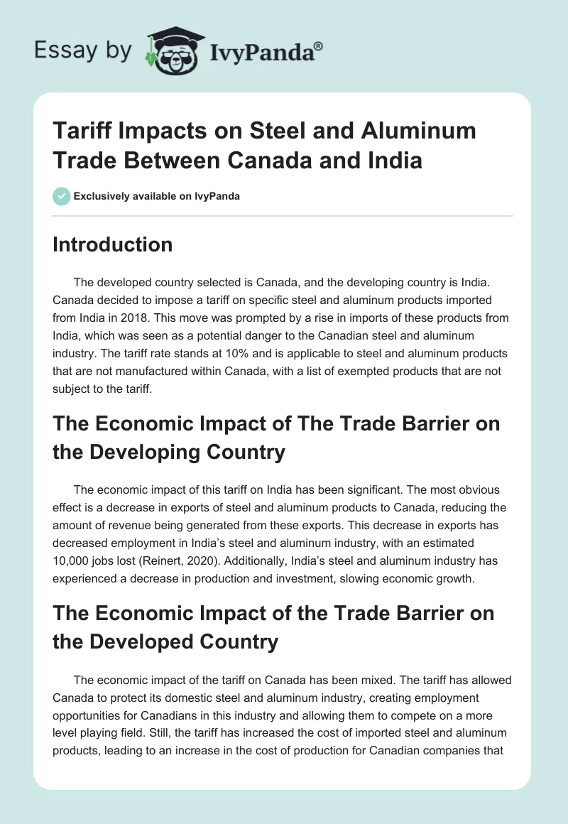 If the tariff on steel and aluminum imports from India were removed, it would remove protection for Canada’s domestic steel and aluminum industry, making it harder for them to compete in the global market. Furthermore, this could cause a surge of steel and aluminum products from other countries, driving down the prices in Canada and leading to a decrease in demand for Canadian products (Carbaugh, 2022). Removing the tariff would create an imbalance in trade. India can become a major supplier of steel and aluminum to Canada. Still, Canada would only be able to export a little to India, resulting in a loss of revenue for Canadian companies.