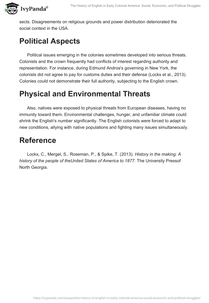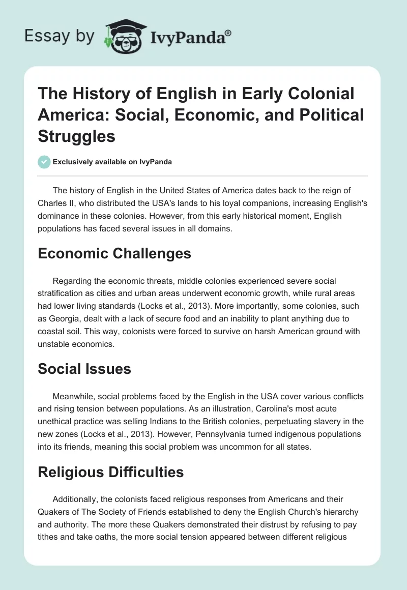 Meanwhile, social problems faced by the English in the USA cover various conflicts and rising tension between populations. As an illustration, Carolina’s most acute unethical practice was selling Indians to the British colonies, perpetuating slavery in the new zones (Locks et al., 2013). However, Pennsylvania turned indigenous populations into its friends, meaning this social problem was uncommon for all states.