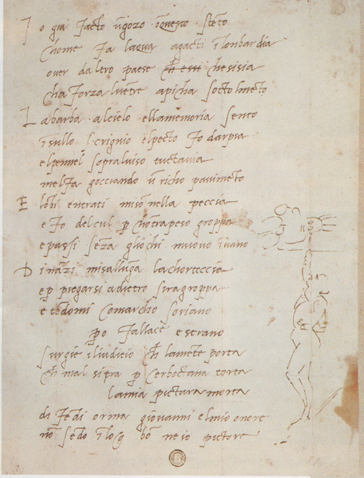 Despite the exhausting task of creating impeccable drawings while being in a most uncomfortable position, Michelangelo saw the situation as rather humorous and was constantly making fun of it: “I’ve already grown a goiter from this torture, /hunched up here like a cat in Lombardy” (Pinsky lines 1–2). The sketch accompanying the poem shows how exactly the paintings were created: